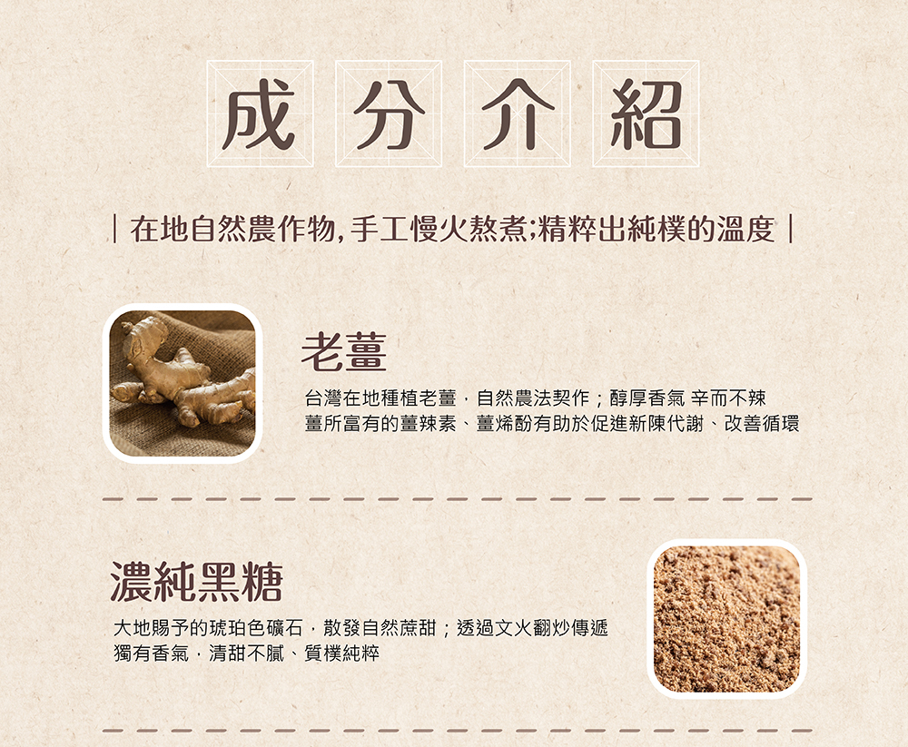 溫潤老薑搭配天然黑糖,入口辛香中帶著柔和甜潤,暖心又暖胃。