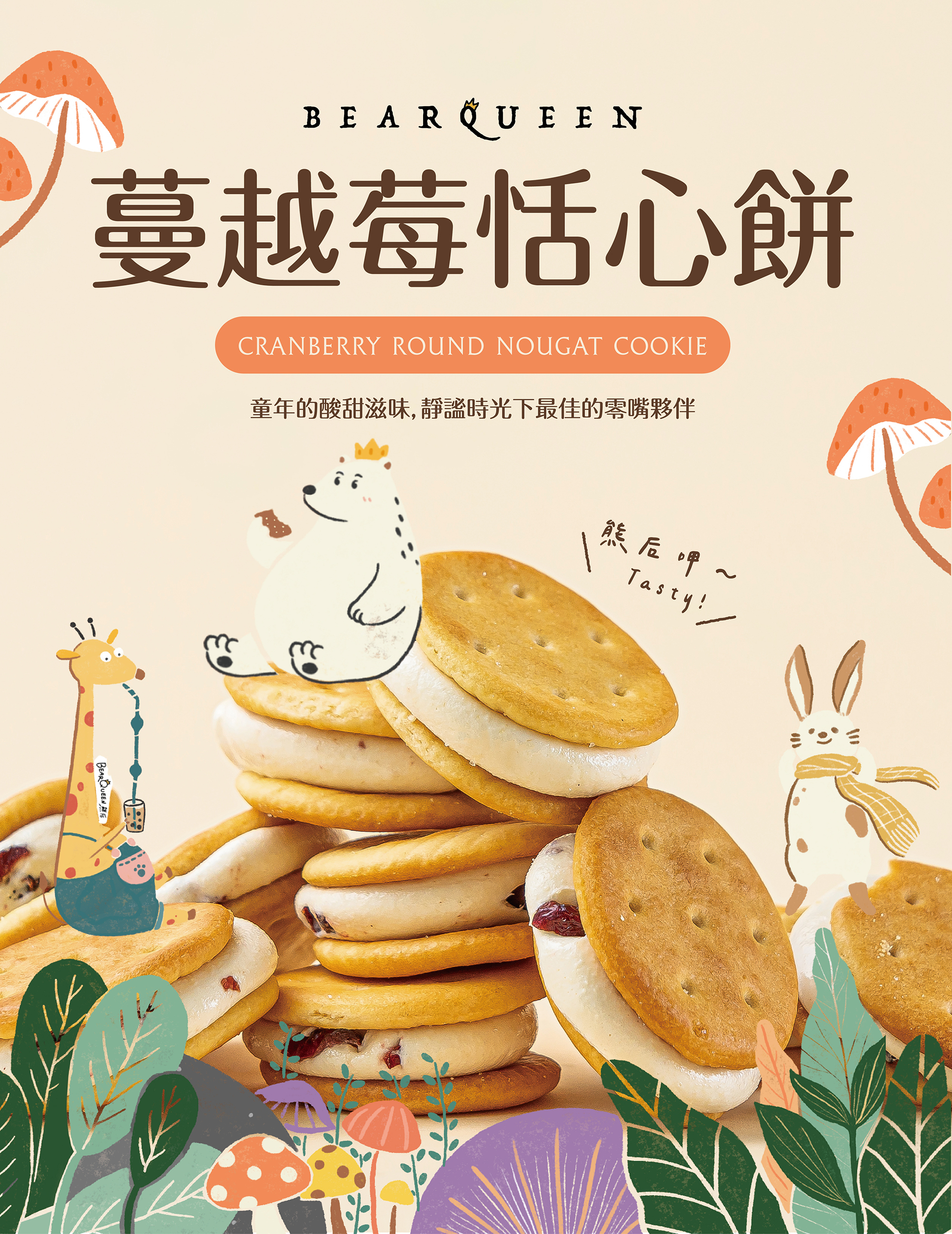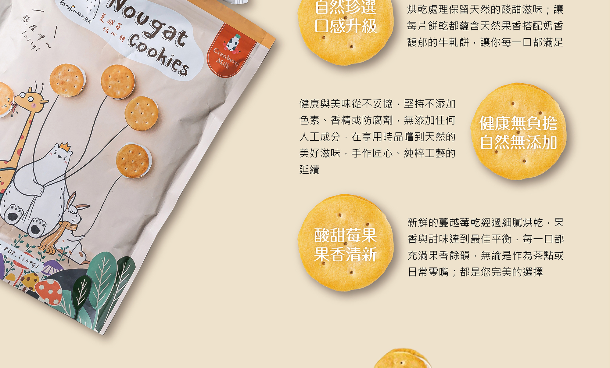 酥脆餅乾夾入綿密牛軋糖,融入蔓越莓的自然酸甜,創造酥脆與柔韌兼具的絕妙口感。