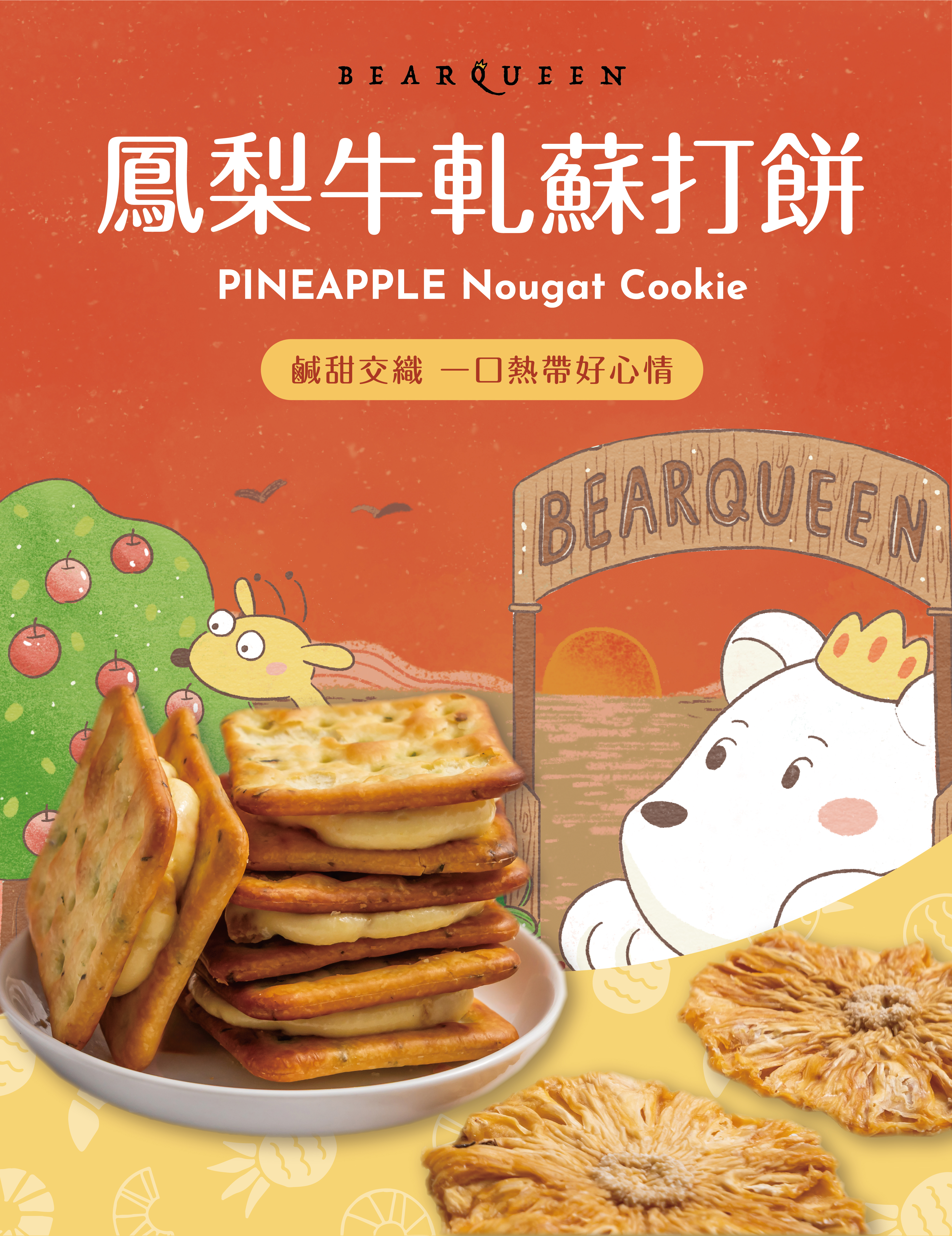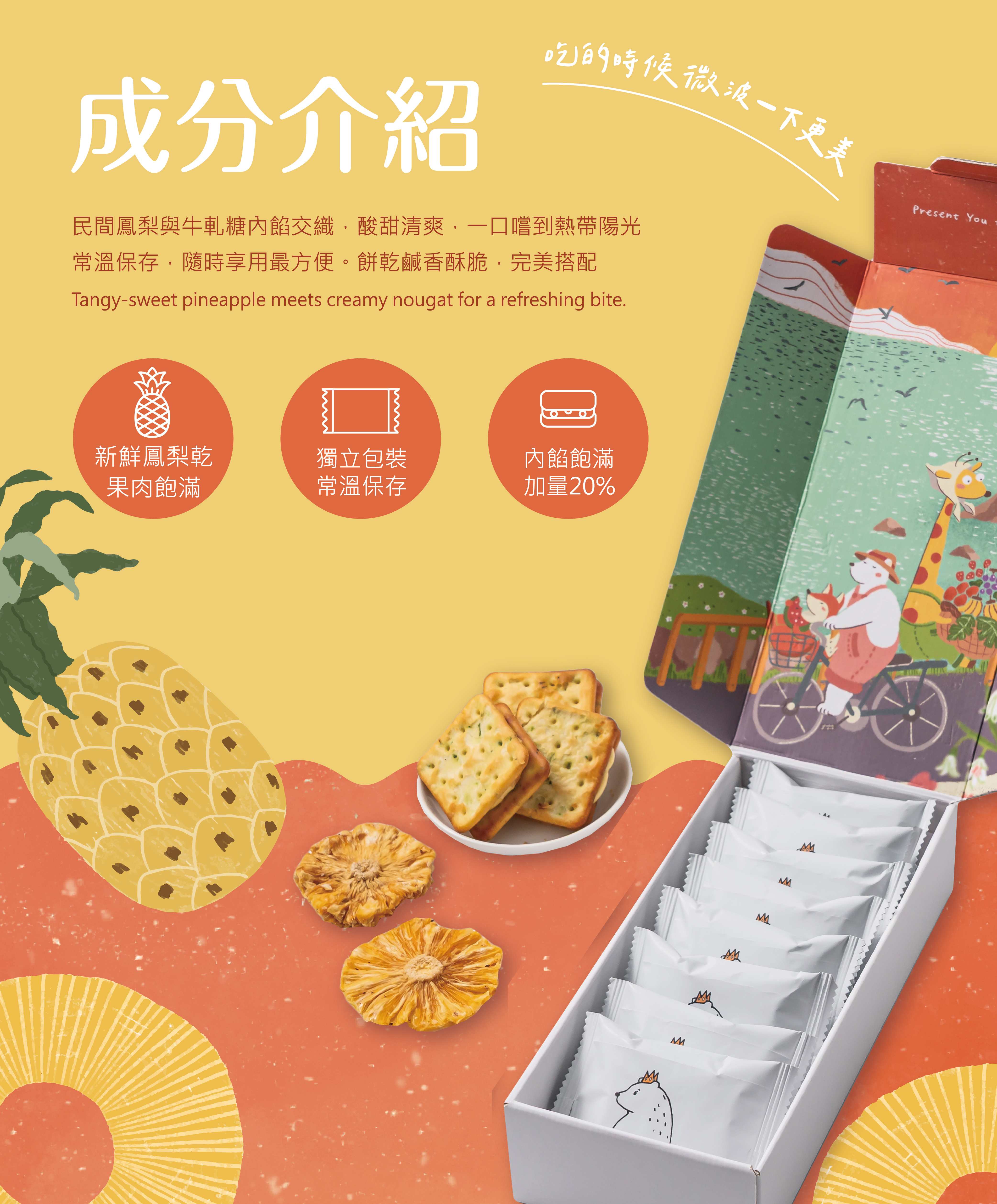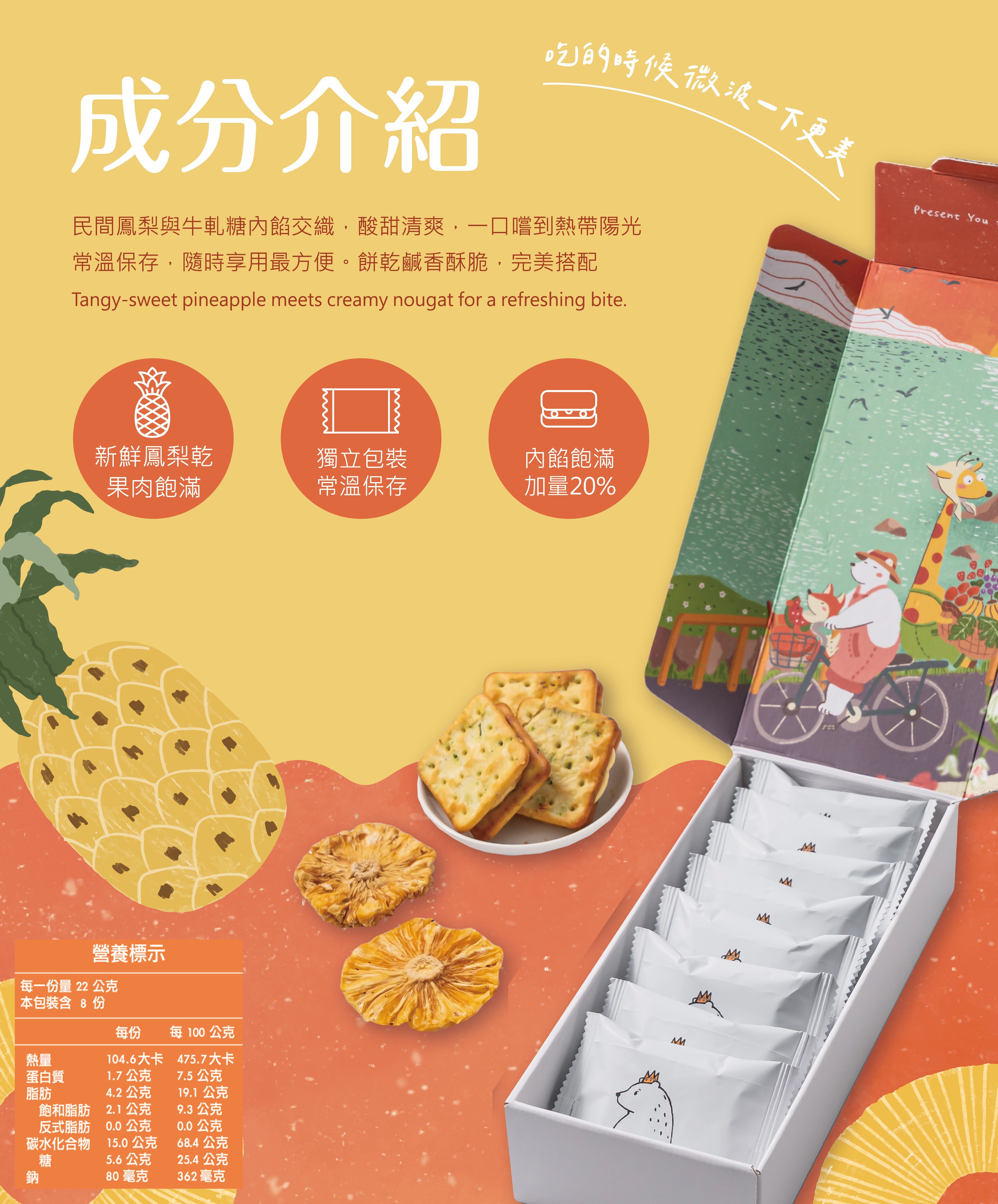 鳳梨果乾與牛軋糖內餡交織,酸甜清爽,一口嚐到熱帶陽光。常溫保存,隨時享用最方便。餅乾鹹香酥脆,完美搭配。