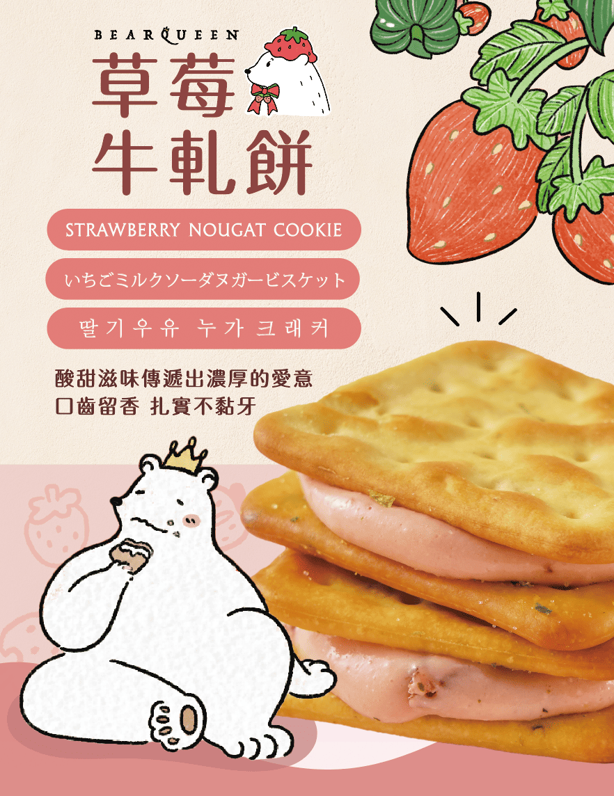 酥脆鹹香的蘇打餅,夾入綿密細緻的牛軋糖,融合草莓的清新酸甜。奶香與果香在口中交織綻放,每一口都是療癒心靈的幸福滋味。
